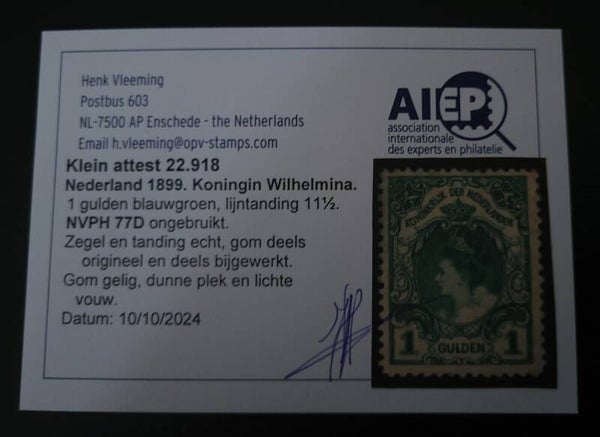Mooie ongestempelde Koningin Wilhelminazegel uit 1905 + ATTEST, zie scan!