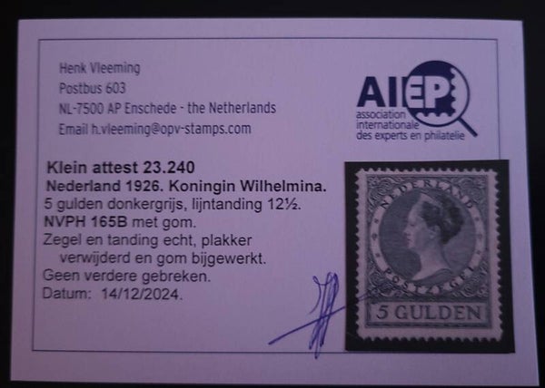 Mooie ongestempelde Koningin Wilhelminazegel uit 1925-1927 met ATTEST, zie scans!