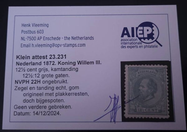 NVPH 22H ONGESTEMPELD + ATTEST