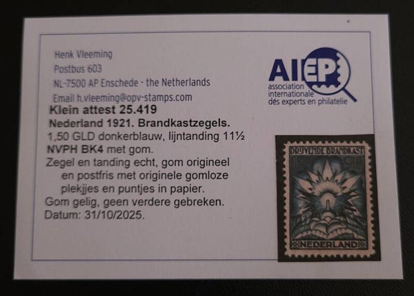 Mooie postfrisse Brandkastzegel uit 1921 met ATTEST, zie scans!