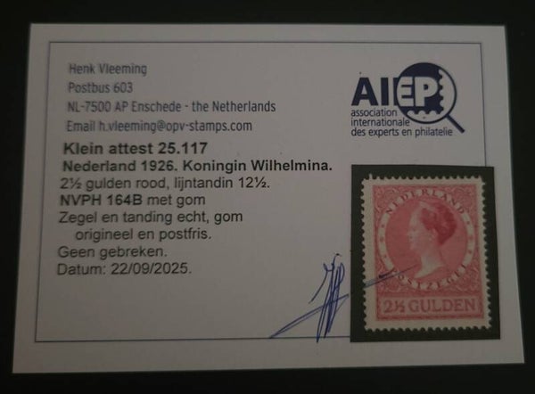 Mooie postfrisse Koningin Wilhelminazegel uit 1925-1927 met attest, zie scans!